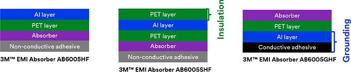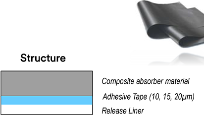 Wide frequency EMI absorber with non-conductive adhesive; Specific products for different frequency ranges; Hybrid absorber/Shield has additional metal foil and PET insulation layer