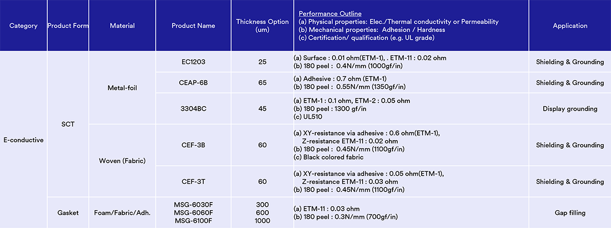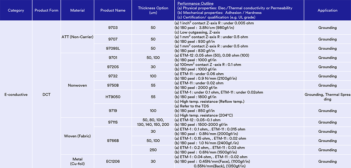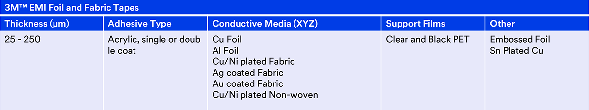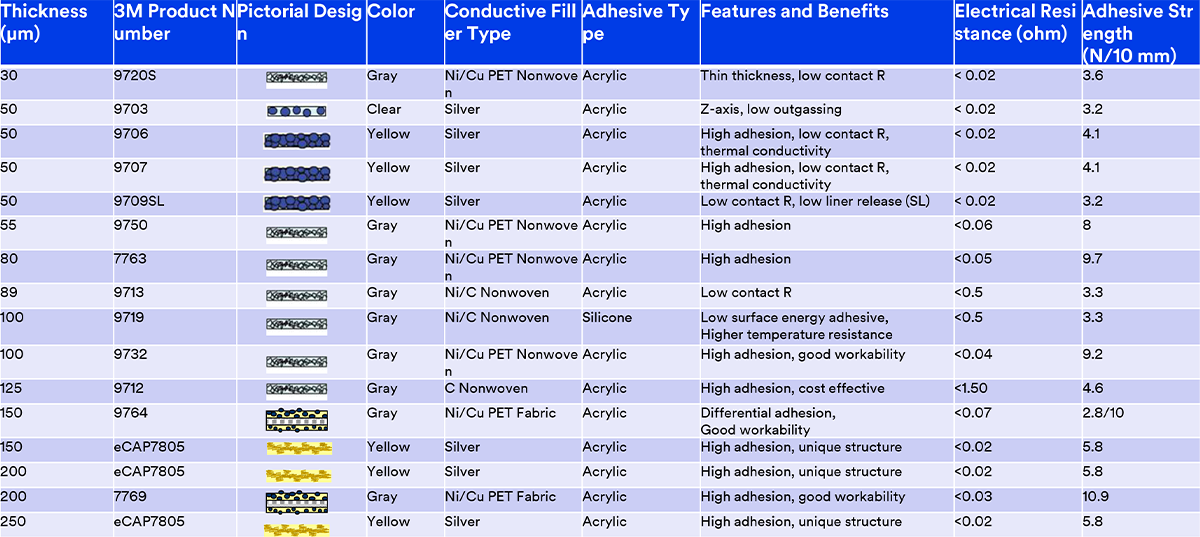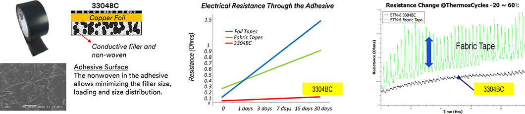3M new generation conductive foil tapes provide highly reliable electrical contact onto small size area thru the conductive adhesive which has the conductive non-woven fabric and well distributed fillers.