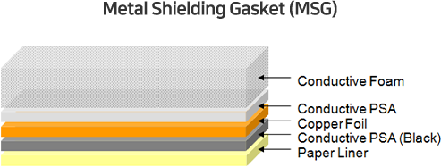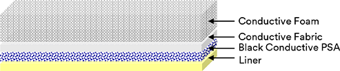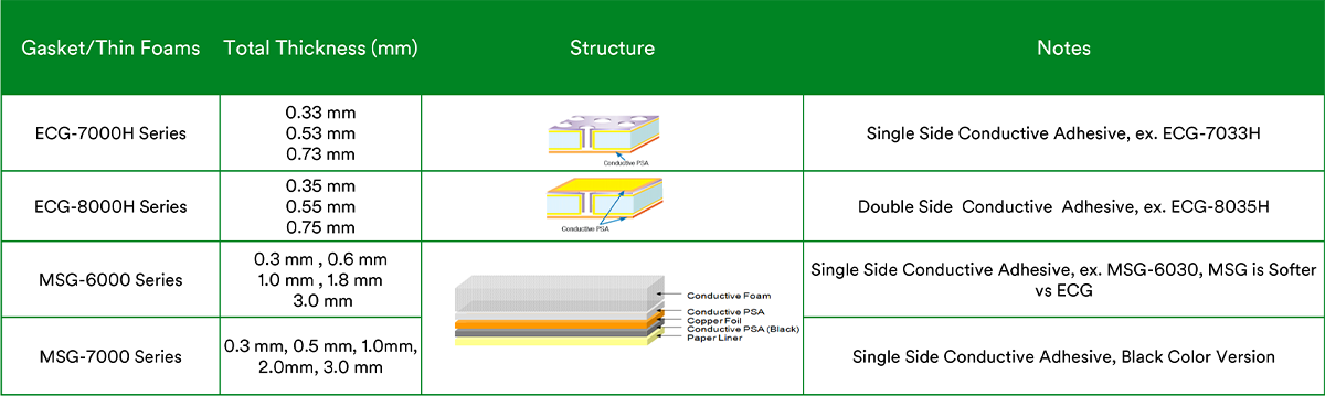 Electrically conductive, compressible foam gaskets with single or double coated conductive adhesive; Shielding gaskets have additional internal copper foil layer