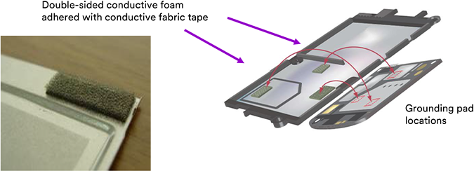 Grounding of two surfaces with wide gaps; EMI shielding