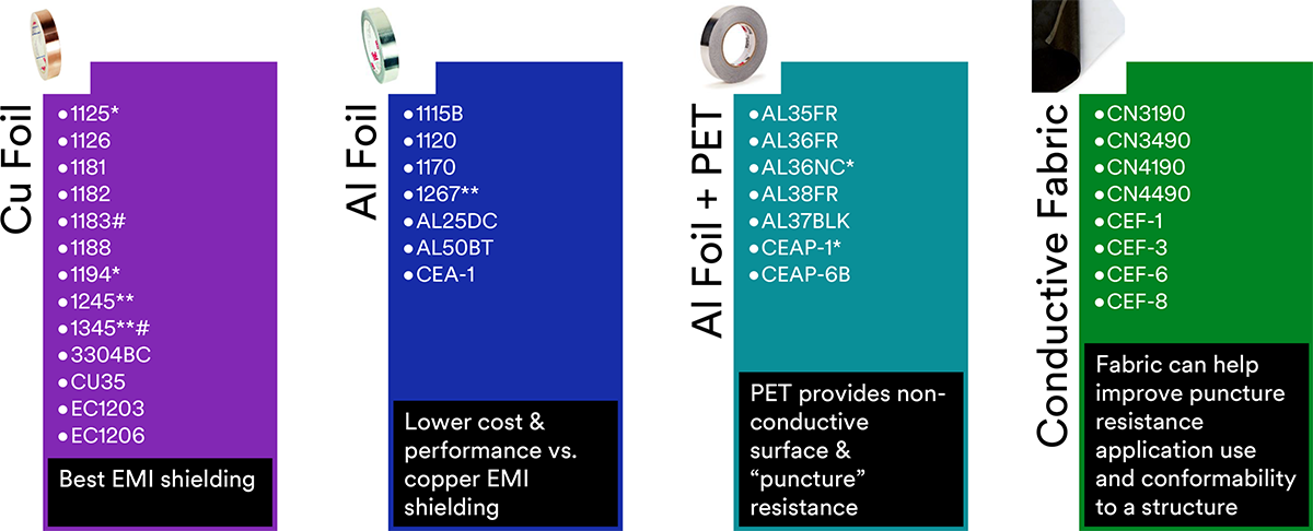 Flexible, conformable tapes that are easily die cut with electrically conductive or non-conductive adhesive, single or double coated on metallic foil or metallized fabrics